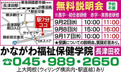 現在県内では、介護関連施設が急増しているため「介護職」は人材不足。時給千円以上、月給20万円以上の職場が急増中!長津田駅徒歩7分で通いやすさ抜群、かながわ福祉保健学院では介護職の必須資格・初任者研修を随時開講。通学・通信コースともに7万9千円(税込)、分割払いや全額返金制度も。最短で講義14日間(振替可)、修了評価試験70点以上で資格取得(無料で追試OK)。介護福祉士を目指すなら実務者研修(3万5千円〜)を。