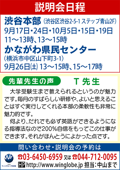 関東近郊に約50校を展開する英語塾「ウィングローブ」では現在、教室を開きたい方を募集している。同教室は小・中・高校生を対象にしており、TOEIC888点、中3で英検準1級、センター試験194点リスニング満点など数々の結果を出している。品詞・文型の指導、同時通訳読み・シャドウィングで、英語が基礎からよく分かる指導法がPOINT。先輩講師の上野さんは「かならず結果が出るのでやりがいがあります。教えるのが初めてでも研修が充実しているので心配ありません。開校時契約金やノルマもなく、初期の負担が少なく、開講前後の研修や定例研修も無料。親身にサポートします」と話している。「進路アドバイザー」の、保護者・生徒面談などのサポートもあり。「興味がある方はまずは説明会へご参加ください」としている。