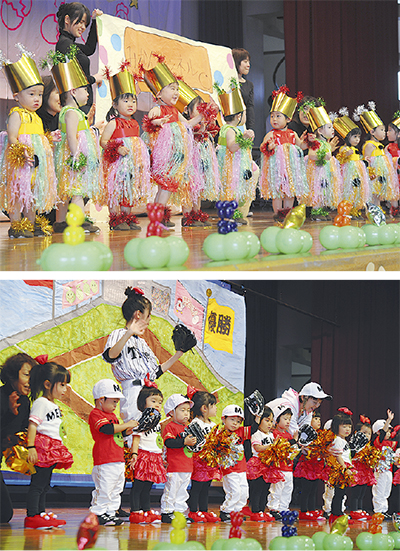 大道具や衣装など演出は両園の職員らによる手作りによるもの。園児約150人が音楽などに合わせ、劇や歌、踊りを披露した=写真。松本園長は「リハーサルを何度も見たけれど、最高の出来だった」と語った。