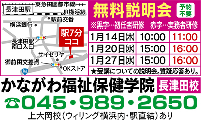 他業種からの転職も多く、就職に有利なのが「介護の資格」。空前の人材不足のため給与も高い職場が増えているのだ。長津田駅徒歩7分で通いやすさ抜群、かながわ福祉保健学院では介護職の必須資格・初任者研修を随時開講。通学・通信コースともに7万9千円(税込)、分割払いや全額返金制度も。最短で講義14日間(振替可)、修了評価試験70点以上で資格取得(無料で追試OK)。介護福祉士を目指すなら実務者研修(3万5千円〜)を。