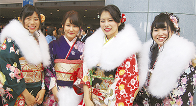 会場周辺では、朝から色鮮やかな振袖を身にまとった女性たちや=写真=、スーツや袴姿の男性たちで賑わい、旧友との再会を喜ぶ姿が多く見られた。