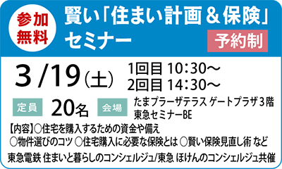 3月19日(土)には、こうした身近な保険の知恵を教えてくれる、賢い「住まい計画&保険」セミナーをたまプラーザテラスで開催。同店と東急電鉄住まいと暮らしのコンシェルジュの共催。セミナーでは、ファイナンシャルプランナーによる保険の話の他、住宅を購入する際に参考になる話も。必要な資金や加入すべき保険、住宅選びのコツなども解説してくれる。「今後の暮らしの参考になれば」と市川さん。申込みは電話予約を。