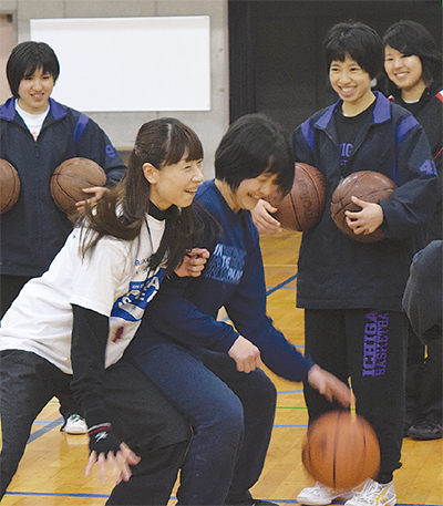 原田さんは、はじめに「バスケの基礎的なこと、変わらない部分を伝えたい」とあいさつ。膝のけがによって引退したことなどを話し、コンディショニングの大切さも訴えた。その後、実際にボールを使ってドリブルの仕方や体の使い方など実践をまじえて指導。部員は元代表の技を体感し、終始笑顔で楽しんでいた。石川一洋顧問は「部員たちと同じ目線で指導してくれ、わかりやすかった」と話した。