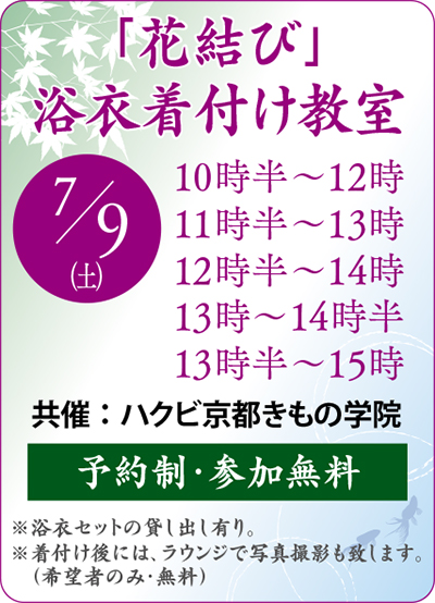 地域住民向けに、無料でさまざまな講座を開いている青葉台フォーラムアカデミー。翌週から夏祭りシーズンが始まる7月9日(土)には、ハクビ京都きもの学院の共催で「『花結び』浴衣着付け教室」を開催する。参加無料、左記から都合の良い時間を選んで予約を。