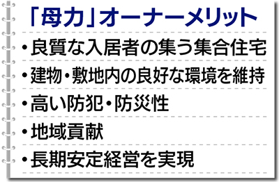 子育て中のお母さんが笑顔になるコミュニティ賃貸住宅をコンセプトにする「母力」。個々のプライバシーを守りつつも、入居者同士のコミュニケーションを大切にする空間づくりと、子どもたちがのびのびと遊べる環境が特徴だ。