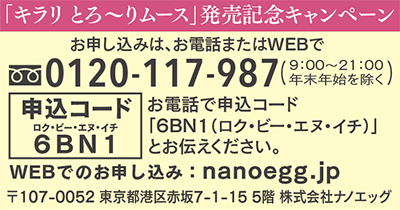 医大発ベンチャー企業(株)ナノエッグの皮膚科学研究チームが開発した白髪用カラートリートメント『KIRARI(キラリ)』。発売以降シリーズ累計29万本突破と好評を博す同商品がパワーアップして新登場。泡タイプの新商品「キラリ とろ〜りムース」は「すぐにしっかり染めたい」との要望に応えて開発された。液だれしにくく毛髪1本1本に密着して均一に包み込むためカラーリング成分が効率よく吸着して深部まで浸透する。