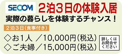 実際の生活を体感できる体験入居を実施中。食事付き・2泊3日で1万円、夫婦2人は1万5千円で利用できるのでこの機会に安心の暮らしを実感してほしい。