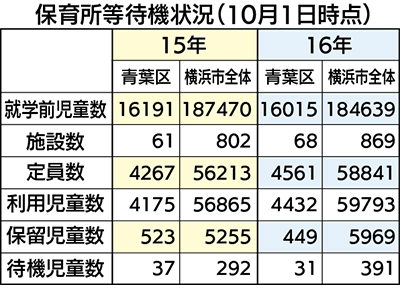 横浜市は12月2日、2016年10月1日時点の保育所等利用待機児童が391人だったと発表した。青葉区では前年同日比で6人減ったものの、31人が待機児童となっている。