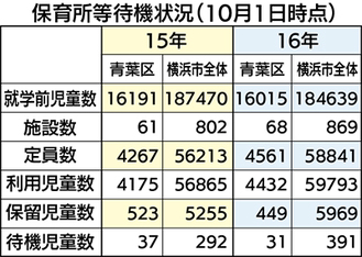 全市的に保留・待機児童が増加する中、青葉区の保留児童は同比74人減の449人、待機児童は同比6人減の31人だった。