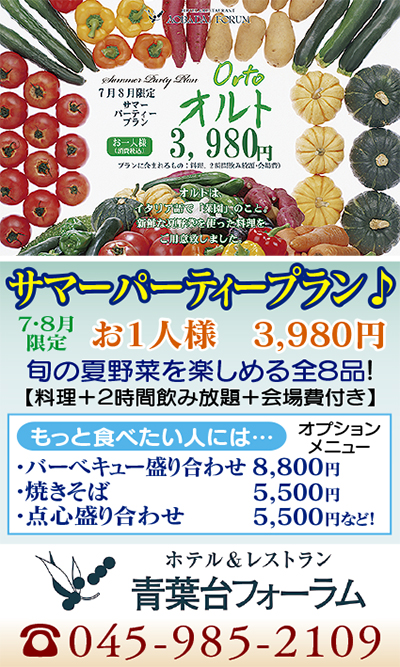 夏の宴には7、8月限定のサマーパーティープラン「オルト」がお勧め。夏野菜を贅沢に使った遊び心たっぷりの全8品に、2時間飲み放題と会場費付きで3980円とリーズナブルだ。仲間との宴にぜひ利用を。