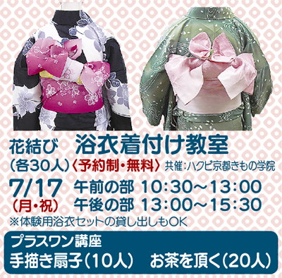 ハクビ京都きもの学院のプロの講師が、初心者から上級者まで丁寧に指導。すみれやバラの花をかたどった可愛らしい花結びで、盆踊りや花火大会をますます楽しめそうだ。着付けの後は写真撮影や、手描き扇子かお茶のいただき方を学べるプラスワン講座も予定。