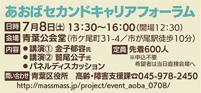 得意なことや好きなことを通じ、多くの青葉区民がまちづくりに関わってもらいたいと、青葉区役所は「あおばセカンドキャリアフォーラム」を7月8日(土)に青葉公会堂で開催する。