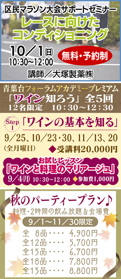 生活をより楽しくする青葉台フォーラムアカデミー。10月1日は、区民マラソン大会サポートセミナーとして「レースに向けたコンディショニング」を開催する。講師は多くのトップアスリートを手がける大塚製薬(株)が担当。食事や休養、リスクに備えたコンディショニングなど日々のトレーニングで疲労を残さず、当日力を出しきる方法を学ぶ。