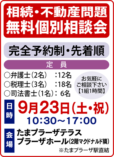 自宅の適正価格を知るのも大切な相続対策。同時開催の不動産個別相談会では、自宅の査定や所有不動産の有効な活用法などにも対応。将来的な売却や購入を考える人も、ぜひ足を運んでみては。申し込みは下記へ、お早めに。