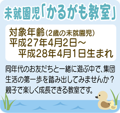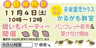 同園では11月4日(土)午前10時から、0歳〜4歳児の子どもと保護者を対象にした園庭開放を実施。また、18年度未就園児クラス「かるがも教室」の募集もこの日から開始する。かるがも教室は【1】年20回の隔週コース(月・水)と、【2】年40回の週1コース(火・木・金いずれか)を用意。「園庭開放日から、未就園児クラスのパンフレットの配布と受け付けを始めます。定員になり次第締め切りとさせていただきますので、来年度の入会希望者はお早めにお申し込みください」と園担当者は話している(配布は雨天時も実施)。