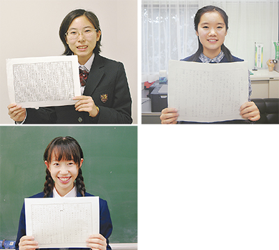 同コンテストには、市内139校から5万9193作品が集められ、校内審査、第一次、第二次審査を経て、最終審査へと進む。最終審査には、25作品が選ばれ、そのうち12作品が最優秀賞を獲得。区内で受賞したのは、青葉台中学校の佐々木愛子さん(1年)、あかね台中学校の春永真穂さん(3年)、山内中学校の川田凜さん(3年)。