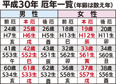 右表は厄年にあたる男女の生まれ年を示したもの。同神社は「節分までに厄祓いをしておくとよいでしょう」と話している。