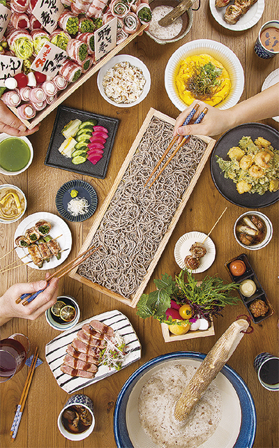提供するのは、厳選した蕎麦粉を独自の配合でブレンドし店内の工房で毎日打つこだわりの蕎麦。中でも11種類のつけ汁から選べる名物「囲み蕎麦」はぜひ味わいたい逸品だ。そして、自然薯栽培の第一人者から仕入れるきめ細やかで粘りのある「純薯(じゅんしょ)」を使ったここでしか味わえない自然薯料理もまた格別。素材をしっかり味わえるものや気軽なオリジナルメニュー等工夫を凝らした料理が並ぶ。