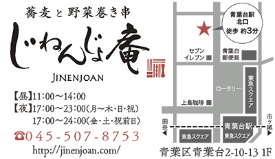 楽しい蕎麦屋を、作りたい――。そんな願いが込められた「じねんじょ庵」が本日2月15日、青葉台にオープンする。店内仕込みの蕎麦にこだわりの自然薯料理、野菜巻き串と体にもココロにも嬉しいメニューが揃う、全く新しい「蕎麦ダイニング」だ。