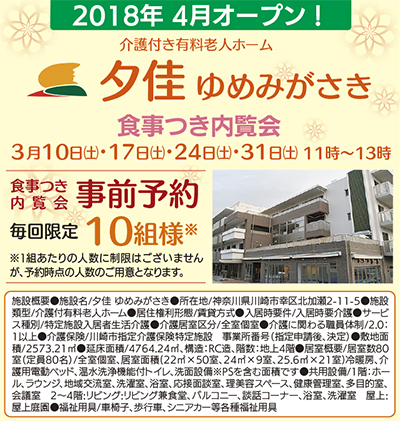 介護付き有料老人ホーム「夕佳(ゆうか) ゆめみがさき」(川崎市幸区北加瀬)は、2018年4月の開所に向け、3月10日(土)、17日(土)、24日(土)、31日(土)に「食事つき内覧会」を開催する。毎回限定10組、要事前予約。