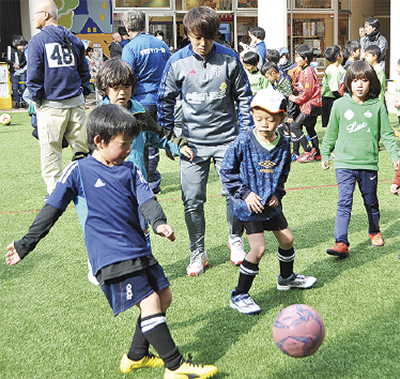 会場では選手とのサッカーゲーム=写真=や、はしご車搭乗のVR体験、煙体験などを実施。父親と煙体験をした男児(8)は「全然周りが見えなくて火事の時は大変だと思った」と話し、また「選手はかっこよかった」と語った。父親は「親子で防災について考えるきっかけになった」と感想を述べた。渕上署長は「フィールズの皆さんのおかげで、多くの人に火災予防を呼びかけることができた」と話していた。