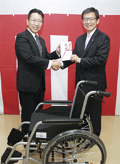 5月8日に工藤建設本社で行われた贈呈式には、工藤建設の工藤英司代表取締役とアルプス技研の今村篤代表取締役が出席。工藤代表取締役は「丈夫な車いすを頂いた。サービス向上に役立てていきたい」と感謝を述べた。