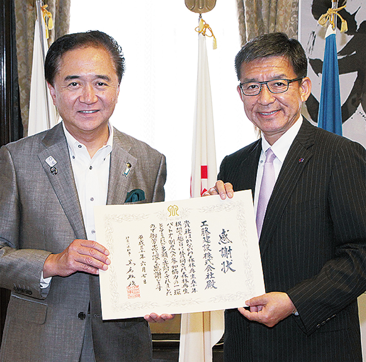 神奈川県と協働で水源林の保全活動に取り組んだとして6月7日、青葉区新石川の工藤建設(株)(工藤英司代表取締役)が黒岩祐治県知事から感謝状を贈呈された。