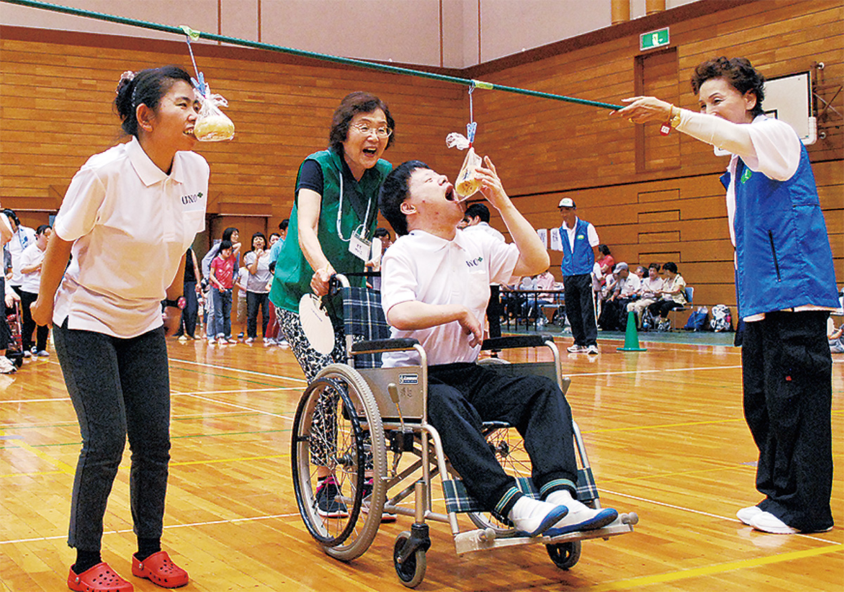 当日は「つながる ひろがる、地域の仲間」をテーマに2会場でさまざまな企画を実施。第1体育室では、ダンスや玉入れ、ハンドベルのパフォーマンスが行われた。毎年人気だというパン食い競争には、あおば地域活動ホーム「すてっぷ」の利用者が作ったあんぱんが使われ、子どもから大人まで大勢が参加。声援が飛び交い、盛り上がりをみせていた。