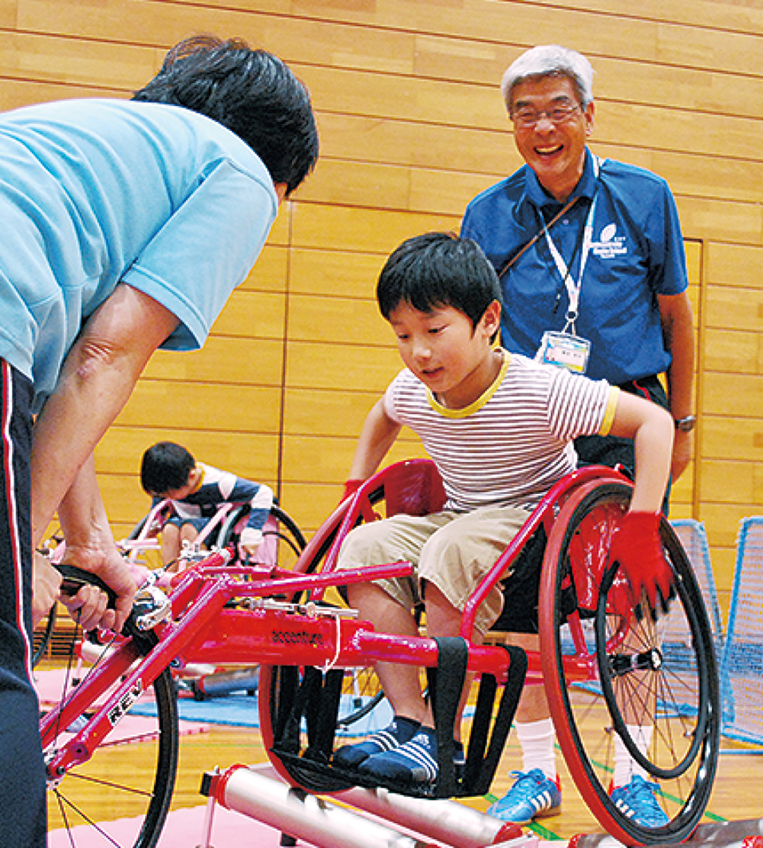 第2体育室では障害者福祉施設での手作り製品の販売や、大型遊具も設置され、たくさんの子どもたちが参加した。競技用車いすに挑戦した後澤(ござわ)佑星君(小2)は「タイヤを回すのが難しかった」とコメント。母親の早苗さんは「体験することで車いすに乗っている方の努力がわかる、いい機会だと思う」と話していた。