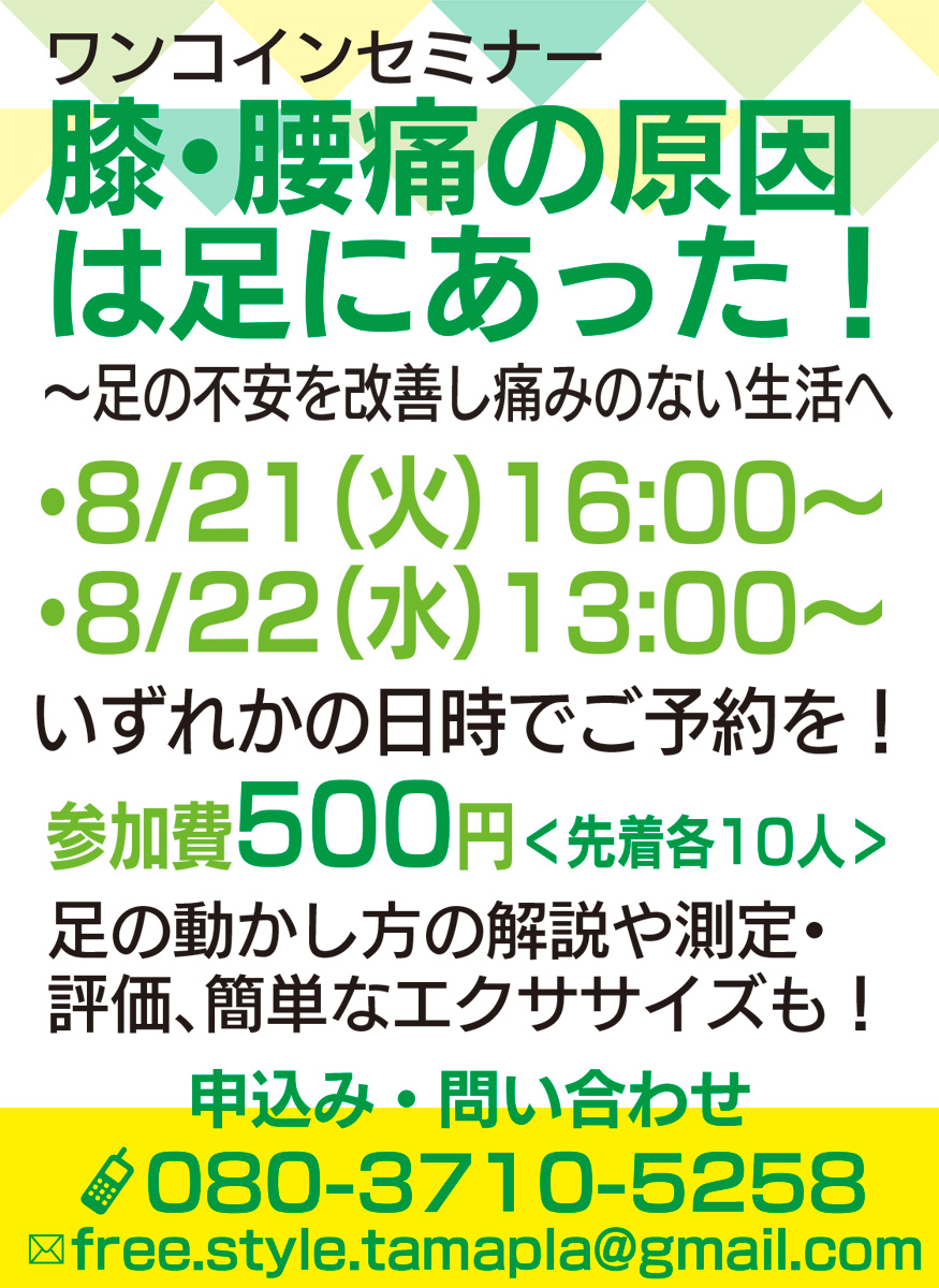慢性的な膝の痛みや腰痛、その原因は、体を支える「足」にあった―。医師監修のメディカルフィットネスジム「Free STYLE」では、そんな足にまつわる悩みを解決するワンコインセミナーを、8月21日(火)、22日(水)に開催する。