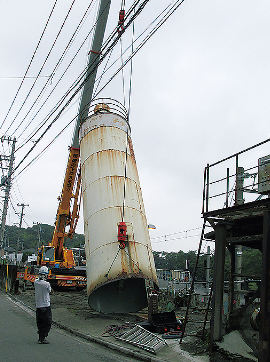 奈良地区で建築資材を取り扱う(株)金子建材(金子晃代表)の高さ10mの生コンプラントが7月23日、大地震に備えて解体された=写真。こどもの国駅そばに立つ円柱の”まちのシンボル”の取り壊しに、地域住民からは惜しむ声が上がっている。