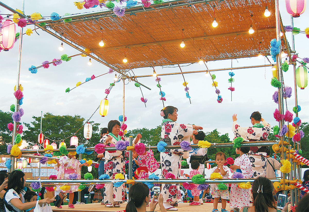 会場には地元住民が詰めかけ、焼きそばなどが並ぶ出店は大盛況。ステージイベントでチアリーディングが行われたほか、子どもたちがやぐらの上で一生懸命に踊る姿も見られた。関根宏一会長は「祭りを通じて子ども達に”ふるさと”を感じてもらえれば」と語った。