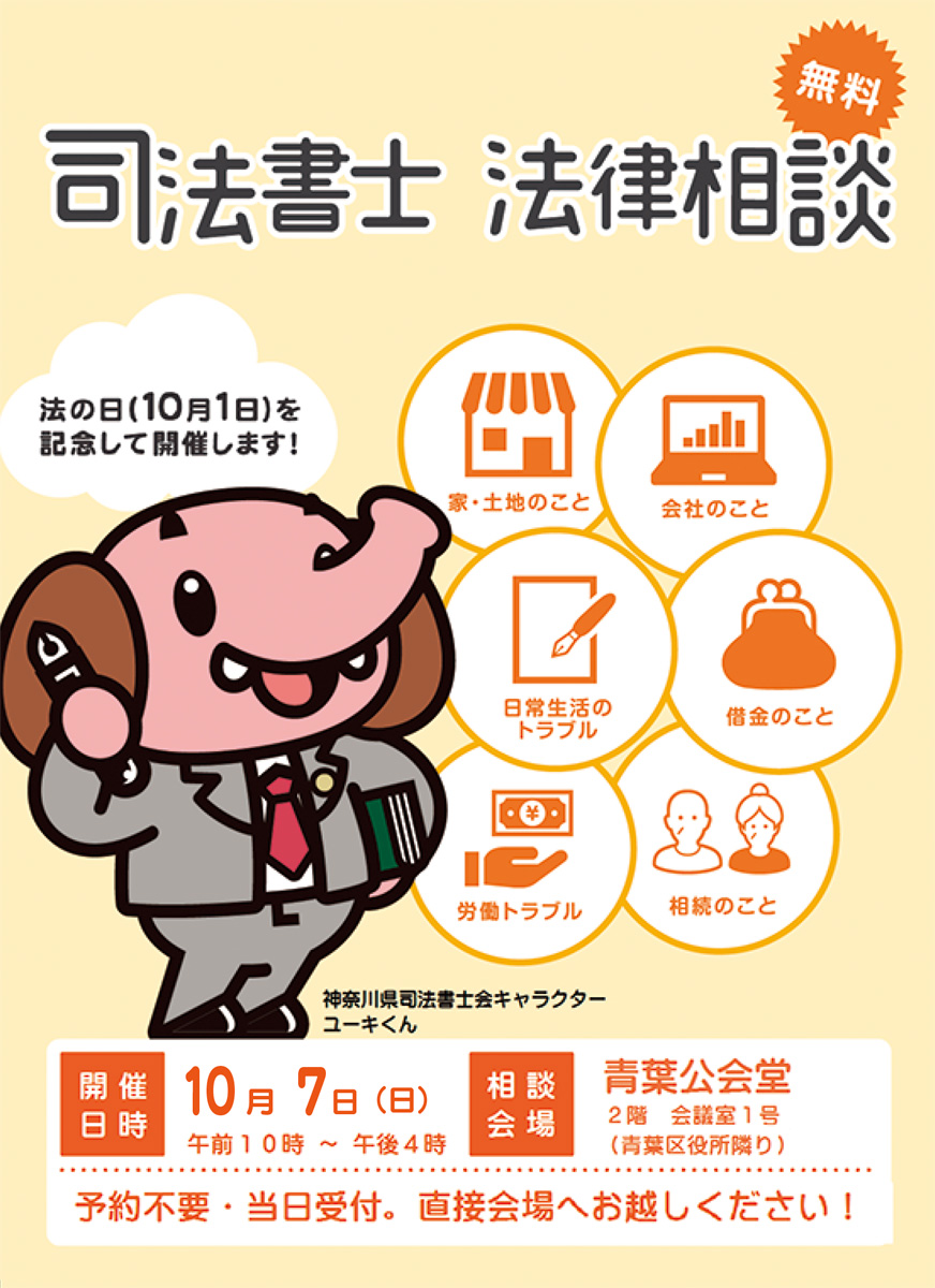 神奈川県司法書士会主催の「無料法律相談会」が10月7日(日)、青葉公会堂で行われる。午前10時から午後4時まで。予約不要、当日直接会場へ。