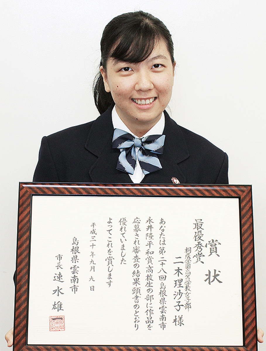 愛と平和に対する考えの作文を審査する「永井隆平和賞」で桐蔭学園高校女子部3年の二木(ふたつぎ)理沙子さん=写真=が高校生の部で最優秀賞を獲得し、9月に表彰を受けた。