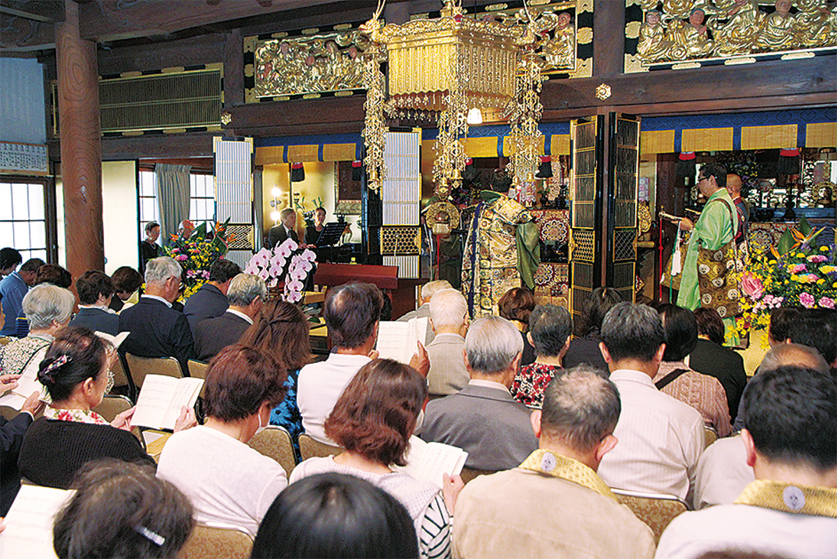 当日は南本住職を含め、7人の住職らが参加。音楽法要の後には本願寺布教使の宮本義宣(ぎせん)さんの法話も行われた。南本住職は「檀家さんからも『良かった』との声も聞けた。無事に終えられたのは周囲の協力があったからこそ」と話す。