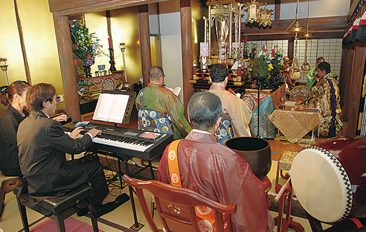 同作法は2011年から12年に行われた親鸞聖人750回大遠忌法要の際に制定されたもの。しかし、住職1人で行うには難しく、また、ピアニストが必要なことから神奈川県下でもほとんど実施されていない。南本住職は「檀家の皆さんに普段は聞けないお経を聞いてほしかった」と導入の経緯を語り、また、ジャズピアニストの滝本博之さんの演奏協力も得られたことで、初開催に至ったという。