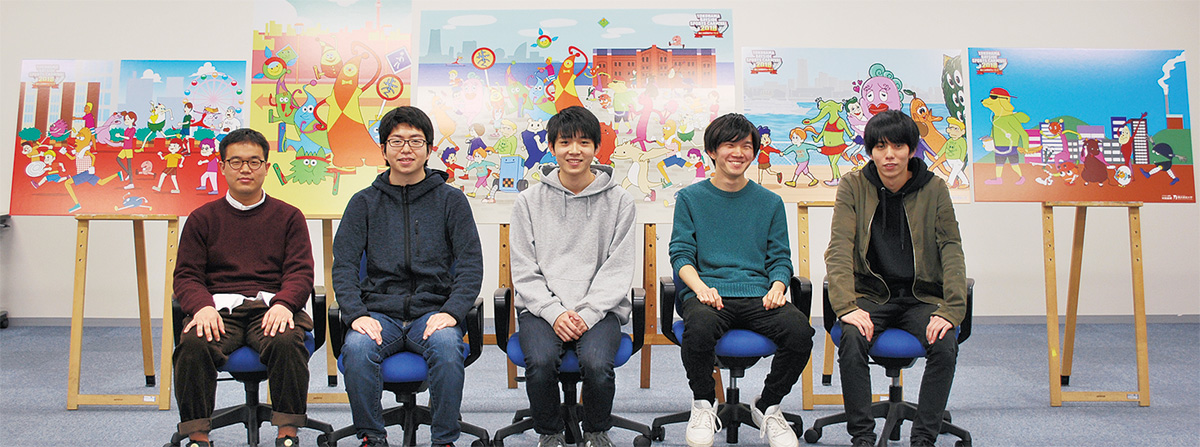 参加したのは吉田圭吾さん、廣部良樹さん、橋本航太さん、都築祐大さん、村田直輝さん=写真。協会からの要望である「アメリカン」のコンセプトのもと、チェックポイントを1人1カ所担当し、約1カ月かけて完成させた。各々自由な発想でデザインしながらも、テイストを揃えるためにすり合わせにも時間をかけたという。「マリンタワーなのでタワーをイメージしたキャラクターを入れた」、「大桟橋はデートスポットなのでラブリーな感じにした」などポイントに合わせて個性豊かなデザインに仕上げた。スタート地点の馬車道を担当した吉田さんは「自分が思っている以上の作品ができた。たくさんの人の目に留まったらうれしい」と笑顔をみせた。