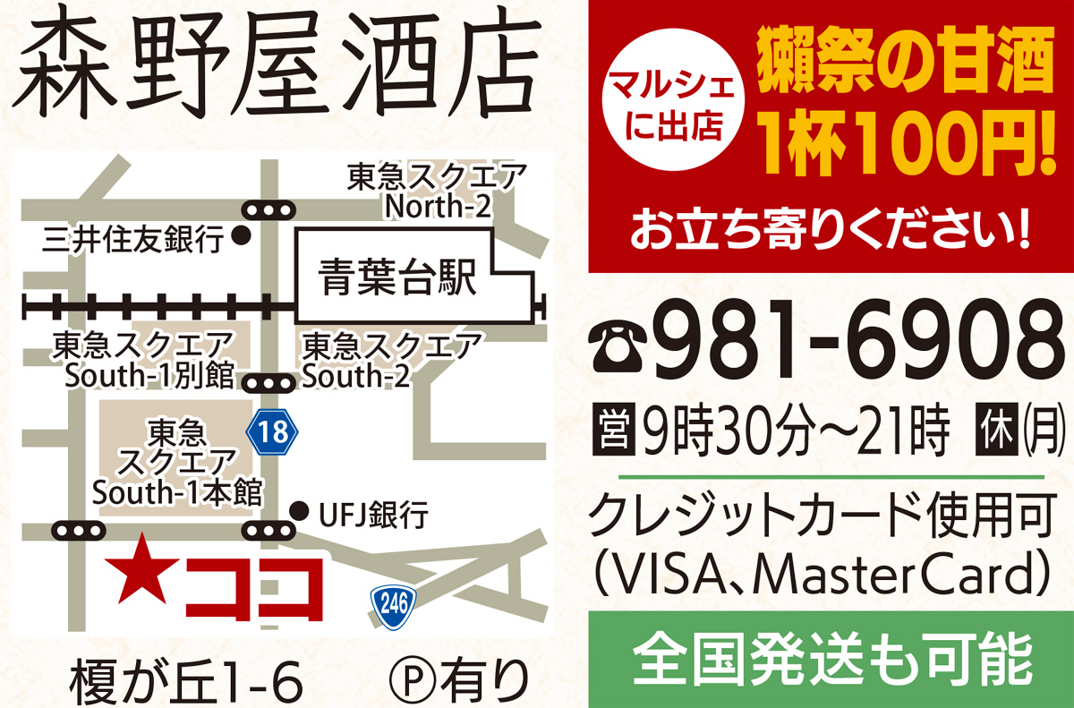 今秋新発売された銘酒「獺祭」の甘酒。青葉台の森野屋酒店で早くも人気を博している。獺祭の麹と山田錦から作られた甘酒は、お酒と同じく後味すっきり。ノンアルコールなので、子どもにも。785g入り918円。