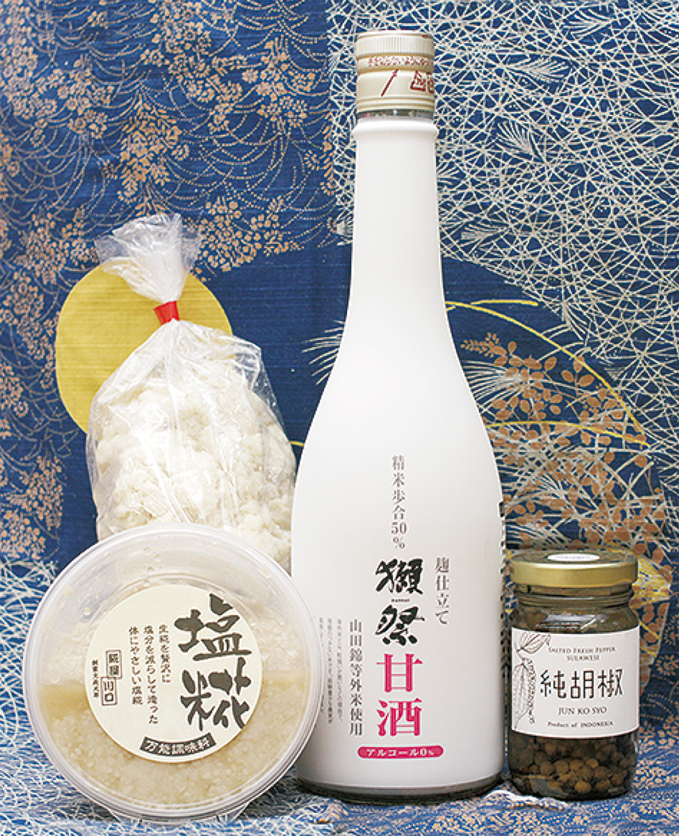 この時期、全国の酒蔵から届く酒粕も隠れた人気。川口糀店の塩糀や三溪園と同じ甘酒、新鮮な胡椒を塩水に漬けた「純胡椒」などの逸品も販売中。