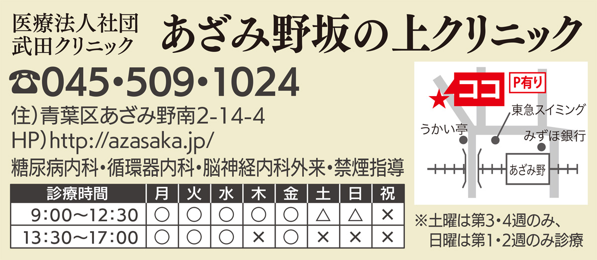 「あざみ野坂の上クリニック」は日本糖尿病学会の指導医・専門医の武田浩医師が運営する糖尿病と生活習慣病のクリニック。昨年からは糖尿病の合併症と言われる認知症に対応すべく、「脳神経内科外来」を開始している。
