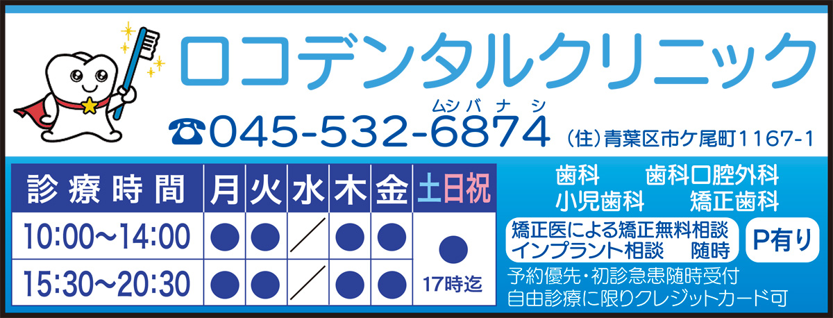 「ロコデンタルクリニック、今年も頑張って参ります」。市が尾駅そばの同院では、平日は午後8時半、土日祝日も5時まで開院。年始も4日から診療を行っている。「今年は開院10年目を迎える年。今後も地域医療に貢献したいと思います」と話す。