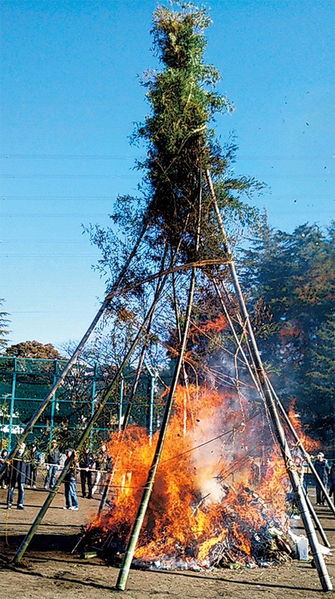 当日は8本の竹が高く組まれ、消防団の協力の下で実施。焼き芋も一緒に焼かれたほか、近隣小学校PTAが餅を焼き、参加者らに振舞った。