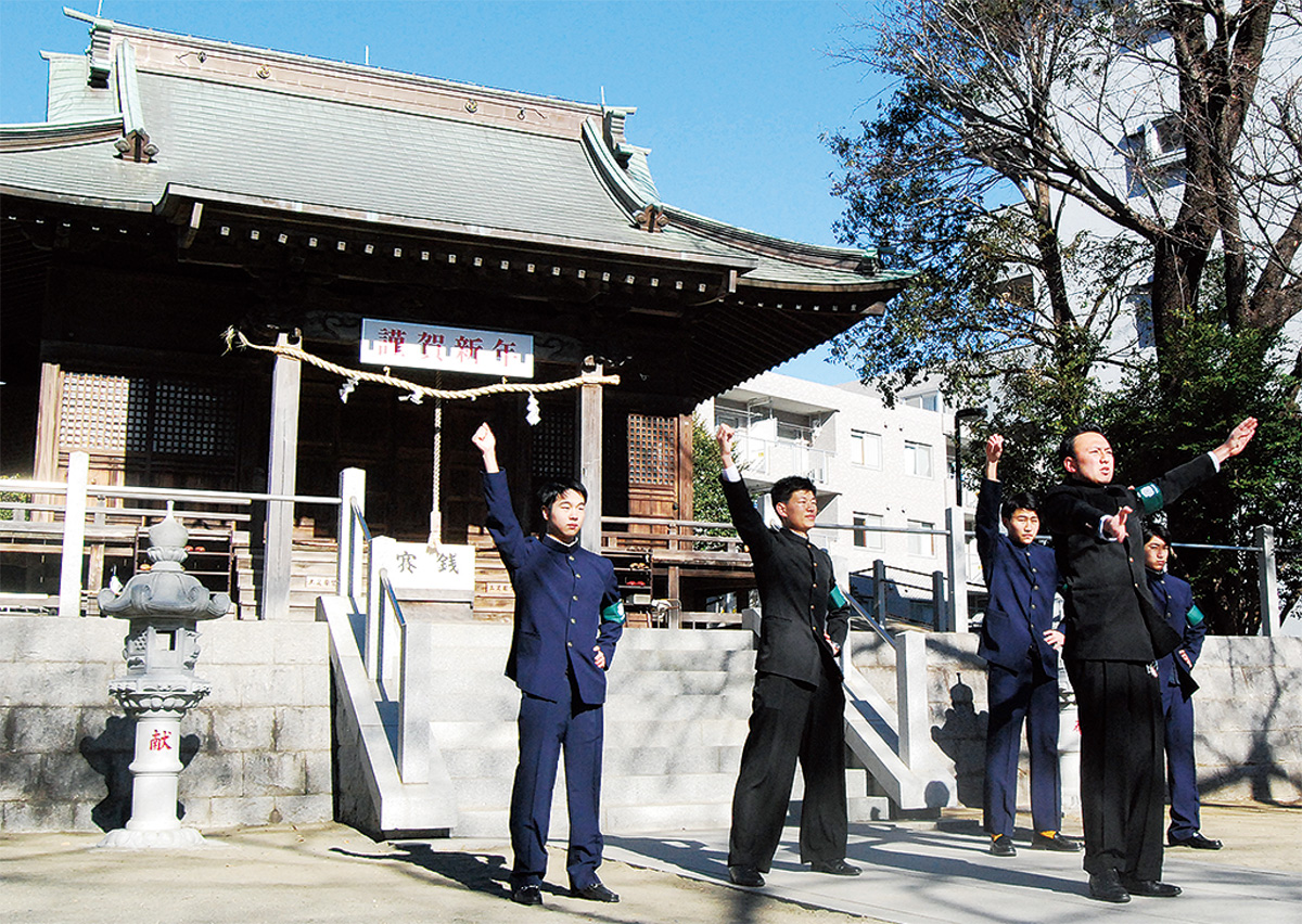 青葉区の人や団体を応援し、区内外に応援文化の魅力を発信しようと活動する青葉応援団(龍口健太郎団長)が1月26日、驚神社で結団正式参拝を行った。神酒の奉納などを実施した参拝後には、団員が「フレーフレー青葉」と青葉区に向けてエールを送る一幕も見られた=写真。