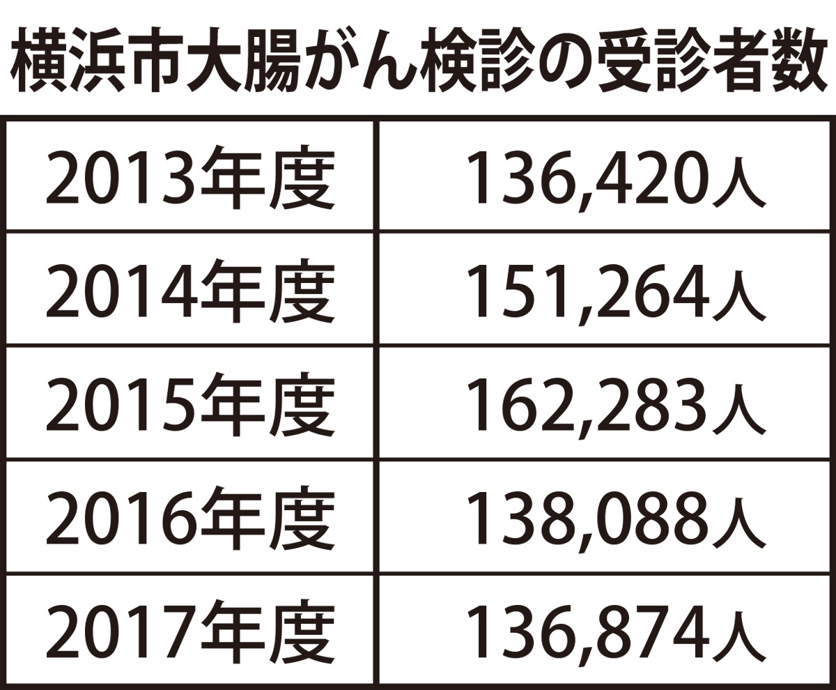 横浜市では、現在個人が加入している健康保険などでは受診機会のない市民を対象に胃、肺、大腸、子宮、乳、前立腺がんの検診を行っている。大腸がん検診は40歳以上が対象で自己負担額は600円。大腸内の出血の有無を調べる便潜血検査で2日分の便を検査する。