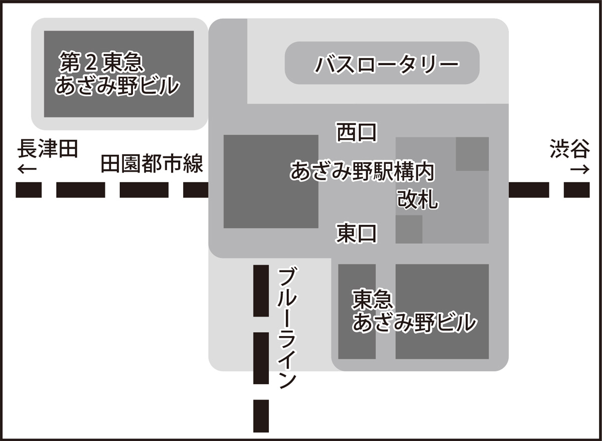 「エトモあざみ野」はあざみ野駅構内と、バスロータリーがある駅西側の「第2東急あざみ野ビル」、駅東側の「東急あざみ野ビル」の3施設から構成される=下記図。施設全体の運営は(株)東急モールズデベロップメント。今回のリニューアルは別々の施設だった3つをエトモブランドに統一し、駅前に一体感を出しながら利便性向上を目指すもの。