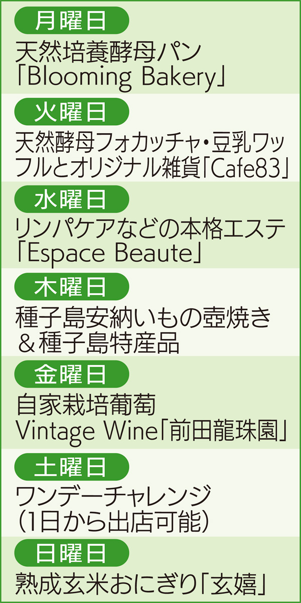 土曜日は現在出店者を募集中。1日でも可。詳細は原田さん【携帯電話】080・3714・0106へ。