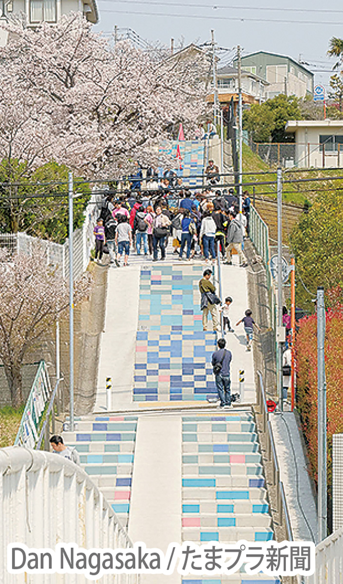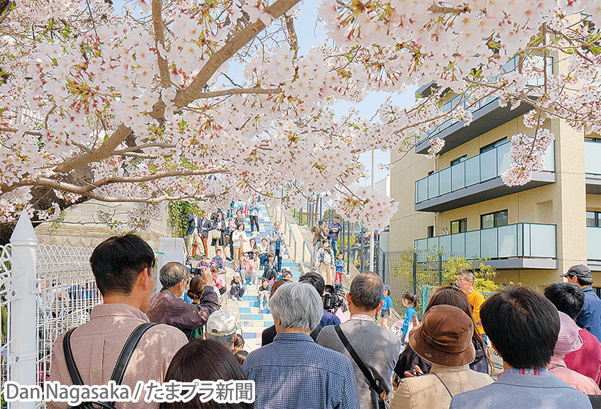 美しが丘小学校前にある百段階段を整備するプロジェクトの「お披露目式」が4月7日に開催された。主催は地元有志などが集う美しが丘中部自治会アセス委員会遊歩道ワーキンググループ。