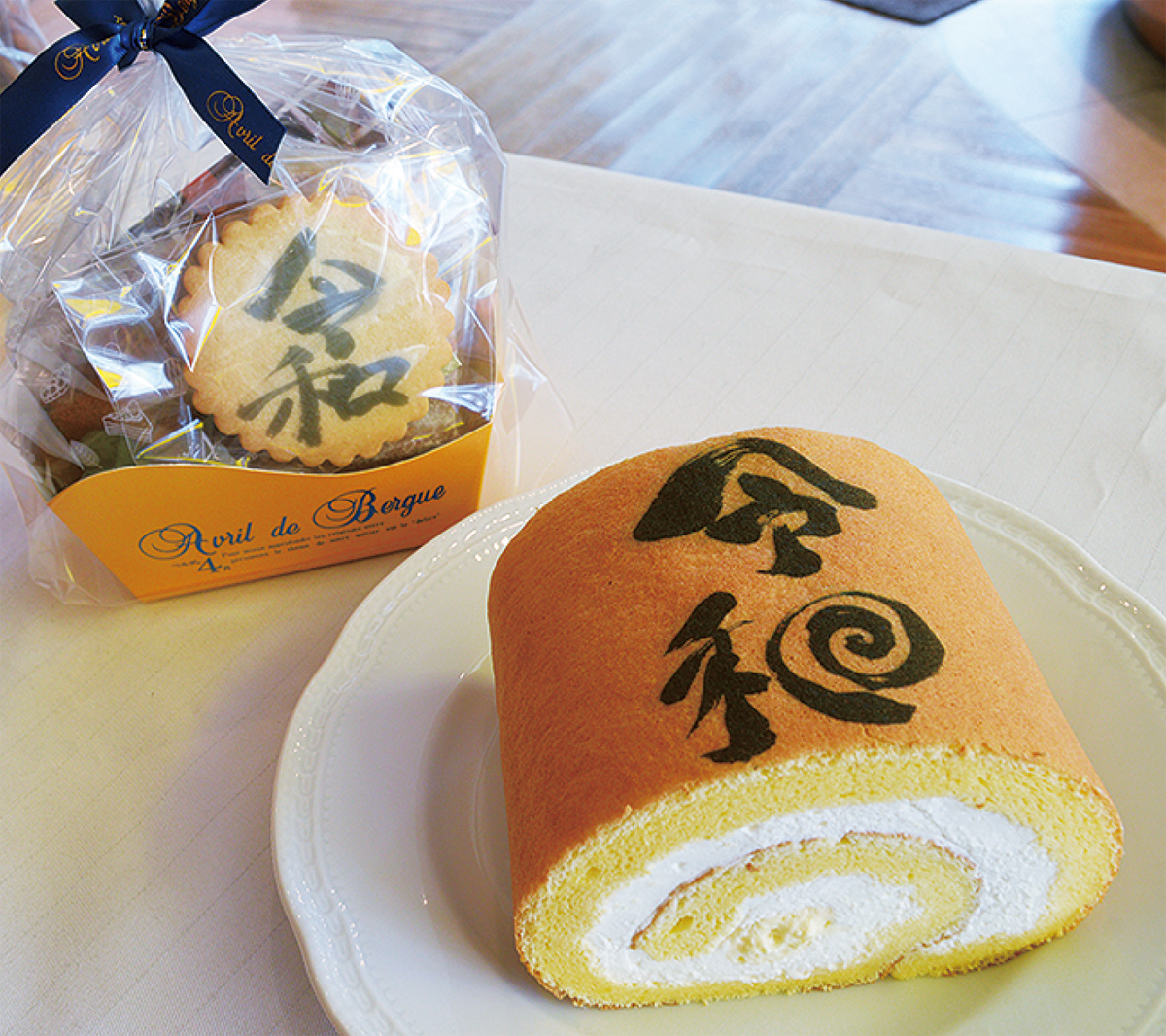 たまプラーザに本店がある「ベルグの4月」は、定番商品の「美しが丘のロールケーキ」を特別にアレンジ。5月4日まで「令和」の文字を入れて販売している。「時代の始まりが素晴らしいものになれば」との思いを込めて企画したもので、「和」の字の右側はロールケーキをイメージして渦巻きに。乳業会社と共同開発したミルク感のあるクリームが特徴だ。また、新元号を記念した焼き菓子のセットも販売している。