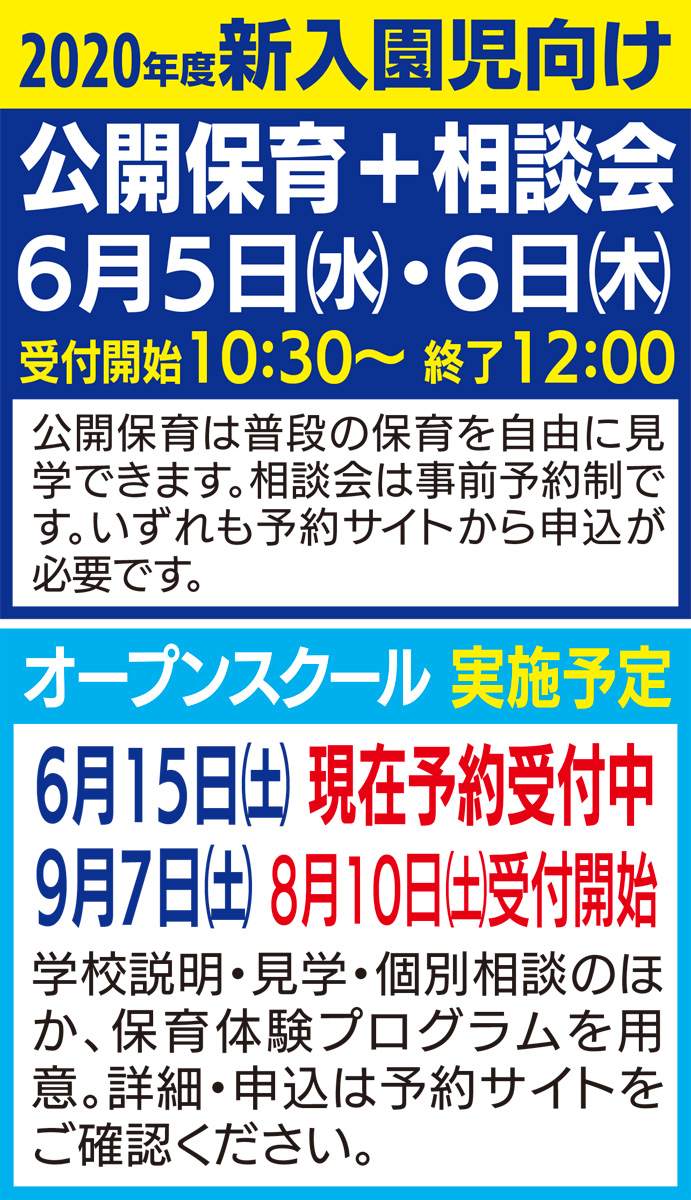 6月5日(水)、6日(木)に公開保育と相談会、15日(土)にオープンスクールを開催。いずれも予約サイト(【URL】https://mirai-compass.net/usr/toink/event/evtIndex.jsf)から要申込。