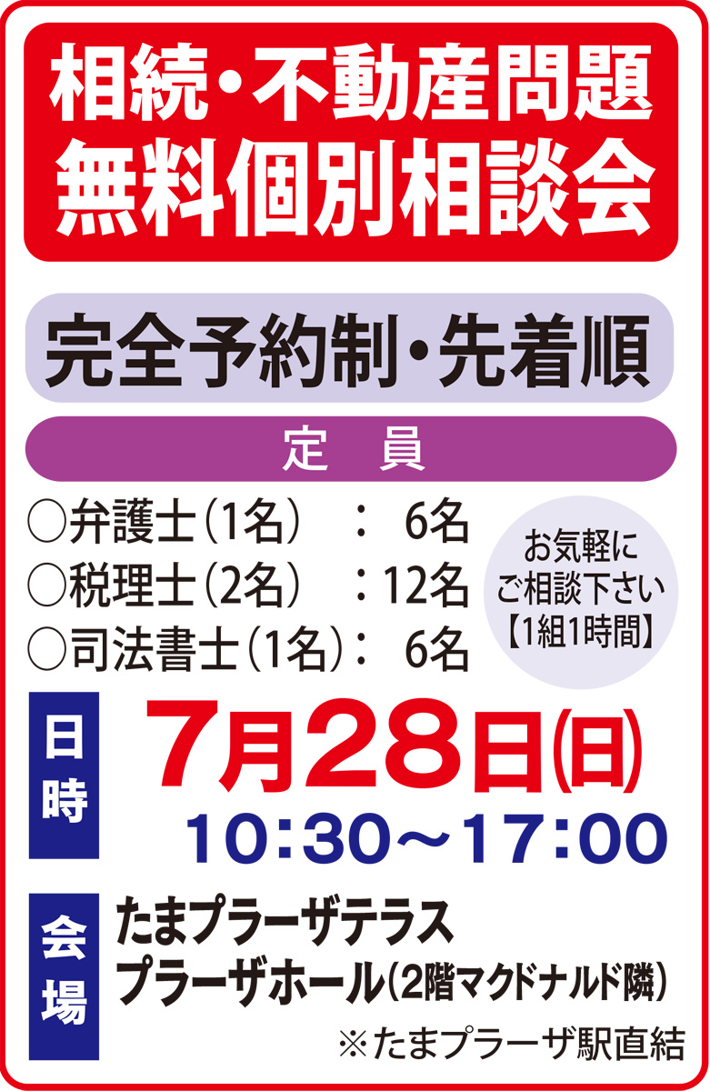 相談会では、相続問題に強い弁護士や税理士、司法書士など頼りになる地元の専門家が一堂に集結。「我が家の相続税対策は?」「認知症の父名義の自宅の売却は?」など多岐に渡る悩みに親身に応えてくれる。遺言書の作成や成年後見制度、不動産売却時の税金対策などにも対応するので、1人で抱え込まずぜひ相談してみてほしい。